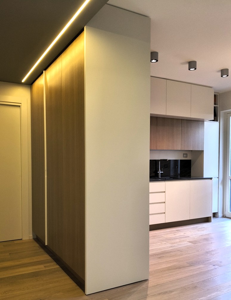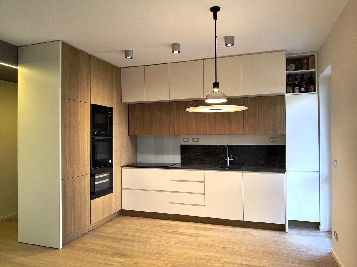 Cucina su misura, struttura in multistrato laminato, finitura esterna in listellare rovere naturale e MDF laccato satinato.