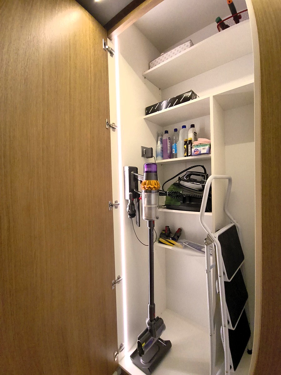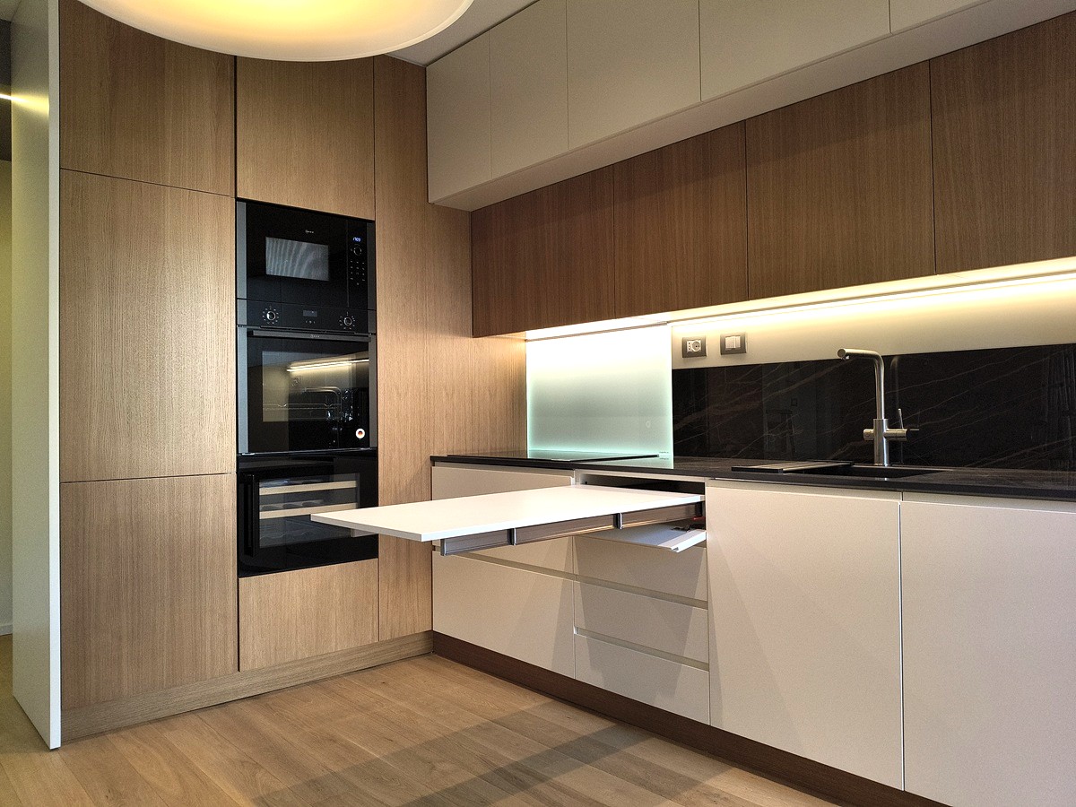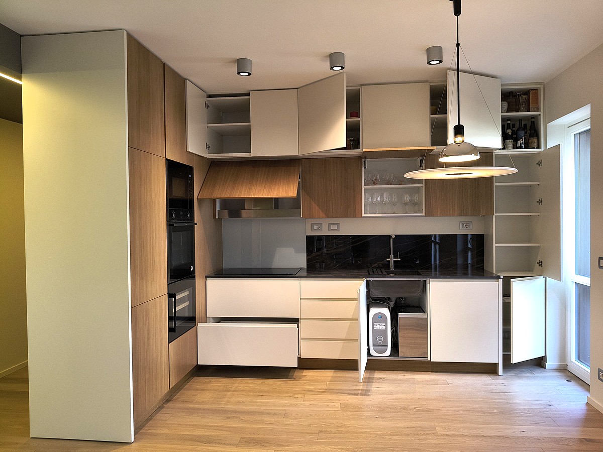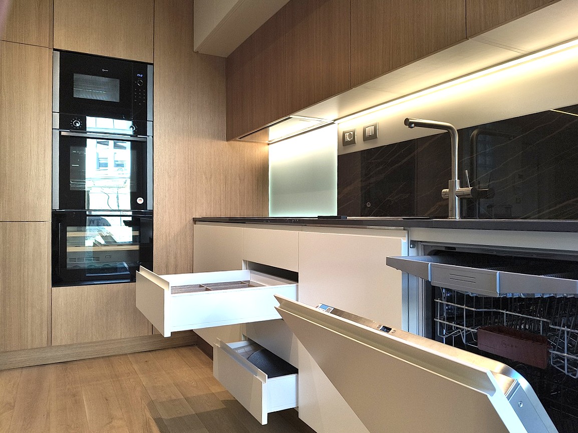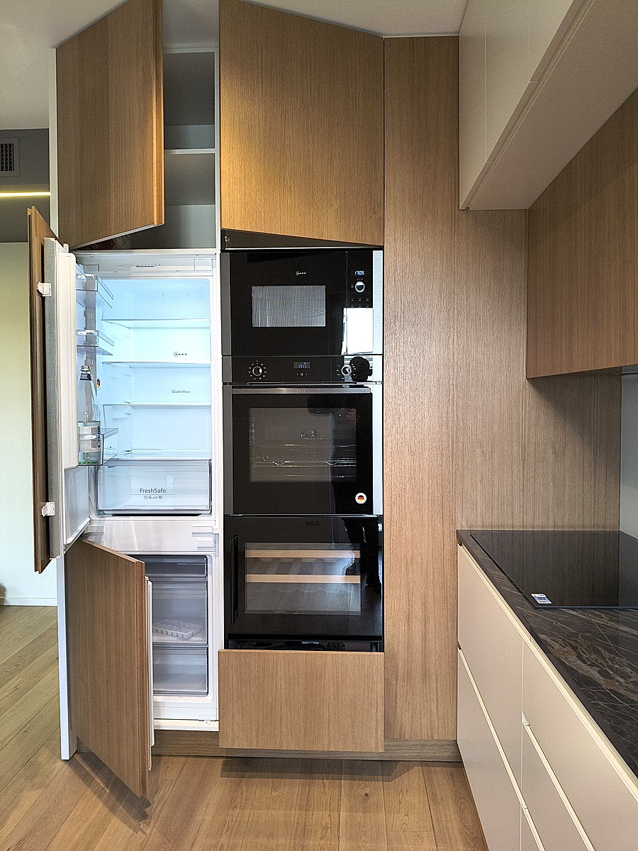 Piano di lavoro estraibile dalla base, lavello in resina sottotop. Elettrodomestici Neff e cantinetta incasso Dunavox.