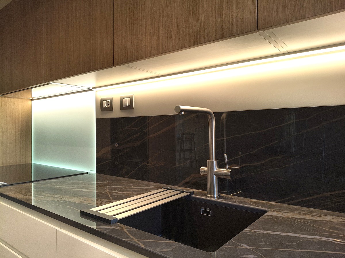 Piano di lavoro e parte del fondale paraschizzi in gres Laminam Noir Desir lucido, 2 cm. Paraschizzi piano cottura in Magnetolab.